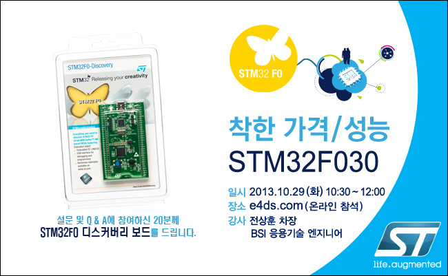 가격은 더 착해지고, 성능은 메가급. ST의 STM32F0시리즈의 최신 제품 STM32F030을 지금 만나세요! 뛰어난 성능과 기능, STM32 제품군만의 독보적인 호환성 등으로 크게 주목받은 STM32F030. 착한 가격으로 출시되어 디지털 가전이나 산업용 제품 제작에서 더욱 큰 가치를 인정받고 있습니다. 초저전력 ARM Cortex-M0 기반으로, 32비트 MCU 시장의 가장 강력한 제품으로 각광받고 있는 STM32F030. 10월 29일, e4ds 웹세미나에서 처음으로 만나세요! 제품에 대한 상세한 소개와 함께, 실제 데모도 확인 할 수 있습니다. STMicroelectronics의 전문 엔지니어들이 직접 답변을 제공하는 질의응답 세션에서, 그동안 가지고 있던 STM32 제품에 대한 궁금증도 해결할 수 있을 것입니다.