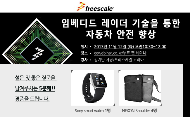 본 웨비나는 자동차 분야에서 대두되고 있는 임베디드 레이더 기술을 통한 자동차 안전 향상에 대해 보다 구체적으로 알아보고, 이것을 어떻게 제품에 적용하는 지에 대해 살펴볼 것입니다. 자세한 웨비나 내용은 다음과 같습니다. 1. Market trend and future ADAS solution (마켓 트랜드 및 향후 ADAS 솔루션) 2. Freescale Radar solution - Qorivva MPC5775K microcontroller (프리스케일 레이다 솔루션 - Qorivva MPC5775K 마이크로컨트롤러) 3. Freescale Radar solution - MRD2001 packaged radar chipset (프리스케일 레이다 솔루션 - MRD2001 패키지 레이더 칩셋) 관심 있으신 분들의 많은 참여를 부탁드립니다. 지금 바로 웨비나에 등록하세요!