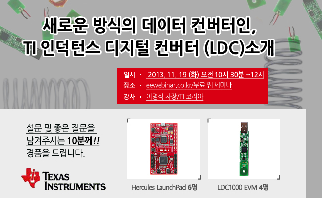 지난 9월에 업계 최초로 공개된 새로운 방식의 데이터 컨버터인 인덕턴스 디지털 컨버터인 LDC1000은 인덕티브 센서로 코일과 스프링을 이용하는 새로운 유형의 데이터 컨버터입니다. 단순한 푸시 버튼, 놉(knob), 온/오프 스위치부터 고분해능 심박동 모니터, 터빈 유량계, 고속 모터/기어 컨트롤러에 이르기까지 다양한 종류의 애플리케이션에 적용 가능하여 오토모티브, 백색 가전, 소비자 가전, 모바일 기기, 컴퓨팅, 산업용, 의료용 등의 다양한 분야에 활용될 것으로 기대됩니다. - LDC1000더 자세히 알아보기: www.ti.com/ww/kr/analog/dataconverters/inductance-to-digital-converter/ - LDC1000 한글 브로셔 다운로드: www.ti.com/lit/kokb002