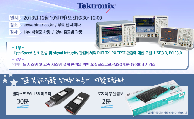 1부 일반적으로 시스템의 TX 테스트는 DUT의 신호품질을 알 수 있는 테스트 입니다. Eye-diagram , Transition 타임 이라던지, DUT 내,외부적 지터 및 노이즈의 특성을 측정할 때 TX테스트를 진행 합니다. 또한 RX 테스트는, DUT에 실제 신호를 입력한 후 출력으로 내놓는 결과가 정상적인지 보는 테스트 입니다.Jitter tolerance테스트란 입력 신호의 품질에 따라 이 DUT가 정상적으로 출력을 하는지 보는 테스트로, 실제 신호를 드라이빙 하는 칩과 칩이 내장된 PCB 그리고 connection을 해주는 커넥터 또는 케이블 까지 모두 하나의 DUT로 묶어 DUT가 세트로 상품화 되었을 때, 동작에 문제가 없는지, 그리고, 정해진 규격내의 노이즈, 지터가 있는 입력신호가 들어 갔을 때, 동작을 제대로 하는지 판단할 수 있습니다. 본 세미나에서는 개발 시스템의 TX ,RX test시에 고려 되어야 할 사항들에 대해 signal integrity 관점과 TX 및 RX 에서 적용되는 Emphasis, Channel embedding, De-embedding 및 Equalization 의 특징에 대해 설명 드리며,실제 여러 application 의 Compliance 에서 규정된 예제를 통하여 test 되어지는 환경에 대해 설명 드리고자 합니다. 2부 MSO/DPO5000B혼합 신호 오실로스코프 시리즈는 최대 2GHz의 대역폭과 10GS/s의 샘플링 속도를 제공하는 Windows 7 과 480GB SSD기반의 모델로 아날로그, 디지털 및 시리얼 신호를 시각화 하고 신속하게 발견하여 복잡한 임베디드 시스템 설계의 문제를 발견하고 진단할 수 있는 장비라 할 수 있습니다. 또한 I2C, SPI, CAN, LIN, FlexRay, RS-232, UART, Ethernet, USB 2.0 등 광범위한 시리얼 버스의 다양한 데이터 형식에 대해서 자동 시리얼 트리거링 및 디코딩 검색 옵션을 제공합니다. 본 세미나에서는MSO/DPO5000B 시리즈의 성능 및 다양한 기능과 어플리케이션 소프트웨어 패키지를 통해 지터 및 EYE-DIAGRAM 분석을 포함한 전문 어플리케이션 솔루션을 제공하는 오실로스코프에 대해서 알아보는 시간을 가지도록 하겠습니다.