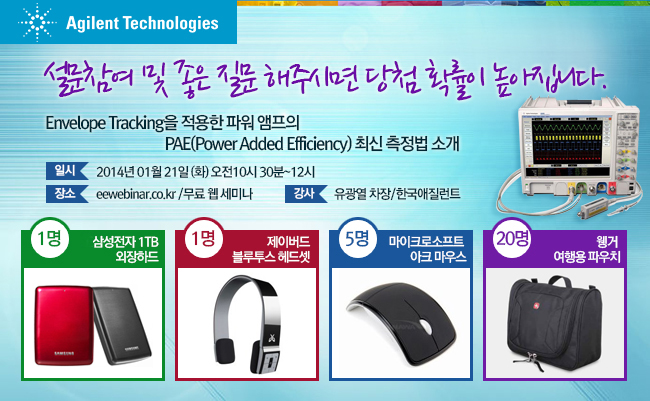 최근 화두가 되고 있는Envelope Tracking 기술에 대해 소개를 드린 후 Envelope Tracking 기술을 적용한 파워 앰프의 PAE(Power Added Efficiency)를 측정하는 구성과 측정법에 대해 소개해 드립니다. 파워앰프의 PAE를 측정하기 위한 구성은 이미 여러 가지가 있습니다만 이번 시간에는 기존 장비 구성 보다 간단하고 편리하게 PAE측정을 할 수 있는 Agilent 8990B Peak Power analyzer의 제품 소개와 측정 기능에 대해 소개합니다.