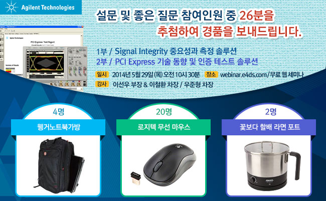 1부 데이터 전송 속도가 급격히 증가하는 최신 고속 시리얼 통신에서 전송 신호의 Signal Integrity 확보는 통신 품질 향상을 위해 더욱더 강조되고 있습니다. 또한 Tx와 Rx간의 연결 채널에 의한 Signal Integrity 손실에 대한 통찰이 필요합니다. 이번 시간에는 Signal Integrity란 무엇인가에 대해 알아보고, 오실로스코프와 네트워크 분석기의 Time Domain 분석을 통한 Signal Integrity 측정 솔루션을 소개해 드리는 시간을 갖고자 합니다. 2부 오늘날 디지털 컴퓨터 및 통신 시스템에서PCI Express는 많은 개발자에게 보편적인 기술 표준이 되고 있습니다. 또한 최근 고속 데이터 전송의 필요와 더불어 높은 효율성 요구를 기반으로 모바일 및 Storage등 광범위한 어플리케이션에 걸쳐 PCI Express 표준 기술의 적용은 확대되고 있습니다. 이번 시간에는 PCI Express 기술 동향과 더불어 PCI Express 표준에서 지정한 인증 테스트에 대한 설명과 측정 솔루션에 관하여 소개 드리도록 하겠습니다.