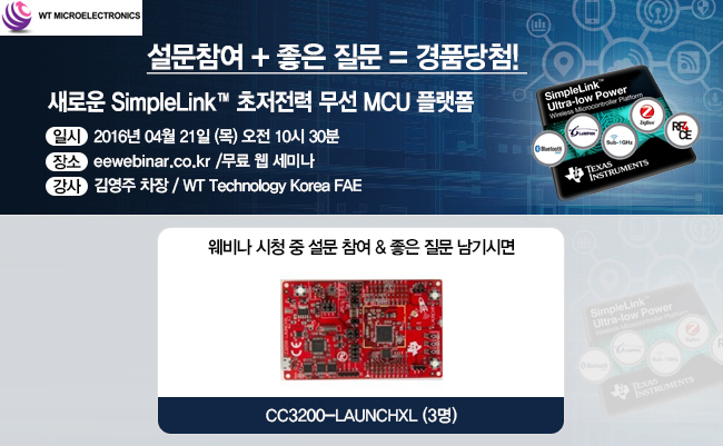 TI는 업계 최저전력이자 유일한 다중 표준 플랫폼을 포함하도록 SimpleLink 포트폴리오를 확장하여 사물인터넷(IoT)을 위한 다양한 애플리케이션을 보다 쉽게 설계할 수 있습니다. TI의 CC3xxx/CC26xx/CC13xx 플랫폼은 최고 20Mbps까지 가능한 업계 유일의 다중 표준 무선 MCU 지원 Wi-Fi, Bluetooth® Smart, 6LoWPAN, ZigBee®, Sub-1 GHz, RF4CE™ 모드입니다 최근 TI의 Simplink 제품이 다음과 같이 출시되었습니다. 1. CC3100/CC3200 모듈은 Wi-Fi 인증 모듈로 임베디드 Wi-Fi와 인터넷 연결 기능을 각종 가정/산업/가전 제품에 쉽게 통합할 수 있습니다. 2. CC2650은 Bluetooth® Smart, ZigBee® 및 6LoWPAN 연결 옵션이 하나의 솔루션을 기반으로 지원됩니다. 다른 소프트웨어만 다운로드하면 됩니다. 3. CC1310은 초저전력 장거리 네트워크를 보다 쉽게 설계할 수 있게 해주어 IoT 기반 설계에 초저전력, 장거리 연결을 손쉽게 추가할 수 있습니다. 이번 세미나에서는 SimpleLink 무선 MCU 최신 제품군을 소개하고 실제 제품을 사용한 데모를 준비하였습니다. 많은 시청 바랍니다.