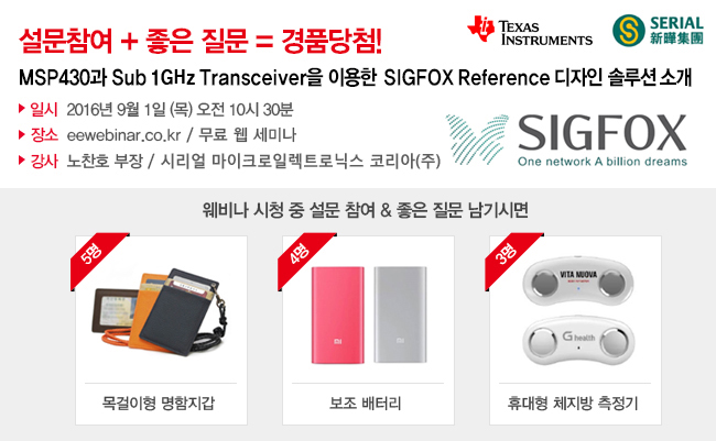 SIGFOX는 IoT Market에서 LPWAN(Low Power Wide Area Network)을 제공하고 있는 Provider로, 이러한LPWAN을 구성하기 위해 Sub 1Ghz network 상에서 Ultra-narrowband solution을 사용 하고 있습니다. TI에서는 Sub 1G Transceiver 와 Low Power MCU인 MSP430을 이용하여, SIGFOX Reference 디자인을 제공하고 있습니다. SIGFOX는 Utility, SmartCity, Healthcare, Consumer, Security, Agricultural 등의 다양한 어플리케이션에 적용될 수 있습니다. 이번 Webinar에서는 SIGFOX에 대한 소개와 TI에서 제공하는 SIGFOX Reference 디자인을 소개해 드릴 예정입니다.