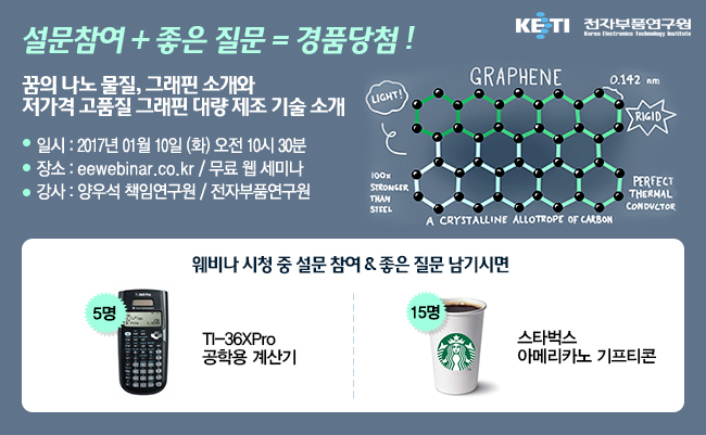 그래핀 (graphene)은 육각형의 탄소로 이루어진 하나의 층으로 이루어진 물질로 높은 강도, 전자이동도 등 여러 특성이 현존물질 중 가장 뛰어난 신소재입니다. 하지만 균일성을 갖는 단일 또는 수층의 그래핀 양산기술은 세계적으로 아직 개발되지 않았습니다. 그래핀의 균일성 및 양산성에 관한 문제는 산업화를 위해 꼭 해결해야 하는 과제입니다. 그래핀은 박리법에 따라 다양한 특성이 나타나는데, 이번에 소개해드릴 그래핀 제조법은 화학적 박리법입니다. 일반적으로 화학적 박리법으로 허머스 공법을 이용합니다. 이 공법은 층간 삽입 속도 제어의 한계, 폭발에 대한 위험성, 고점도 샘플 핸들링의 문제점이 있습니다. 저희 전자부품연구원 그래핀 소재 팀에서는 전단응력을 이용한 반응기를 통해 층간 삽입 속도의 제어, 폭발반응 제어 및 연속 생산 가능성을 확인하였습니다. 이를 통해 고품질 그래핀 대량 생산에 한걸음 다가갔습니다. 이번 웨비나에서 전단응력 반응기를 이용한 그래핀 대량 생산과 관련된 데모를 통해 이해하기 쉽게 소개해드릴 예정이오니, 이번 웨비나에 꼭 참석하시어 그래핀과 그래핀 대량생산에 관한 유익한 정보를 얻어가시길 바랍니다.