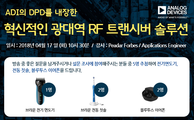 이번 웨비나에서는 세계 최초의 Wideband RF Transceiver With Integrated DPD인 AD9375와 PA를 활용한 DPD 애플리케이션에 대해 설명해드릴 예정입니다. 웨비나를 통해 이해하기 쉽게 소개해드릴 예정이오니, 꼭 참석하시어 ADI의 혁신적인 Transceiver 솔루션을 만나보시고 설계에 도움이 되는 유익한 정보를 얻어가시길 바랍니다.