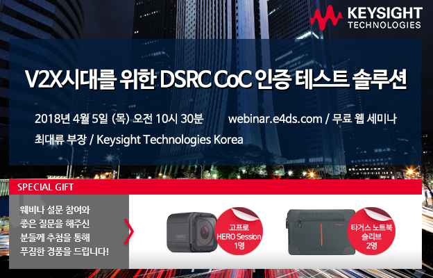 자율주행차를 위한 대표적인 기술인 ADAS와 V2X중, 이번에는 커넥티드카 범주에 속하는 V2X기술의 단거리 전용 통신(Dedicated Short-Range Communications, DSRC)의 기술현황 및 기술표준을 준수하기 위한 측정 요구사항에 대해서 알아봅니다. 아울러 키사이트테크놀로지스에서 새롭게 출시한 DSRC CoC 인증 테스트 솔루션에 대하여 살펴보고, 실제 측정 시연도 진행 예정입니다.
