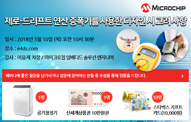 고정밀 연산 증폭기에 대한 필요성이 지속적으로 증가함에 따라, 자가 보정(self-correcting) 아키텍처가 더욱 널리 사용되고 있습니다. Microchip에서 제공하는 이번 웹 세미나에서는 제로-드리프트 증폭기에 대해 자세히 설명해 드릴 것입니다. 제로-드리프트 아키텍처의 개요와 함께, 노이즈에 따른 고려 사항과 누설 전류(leakage current), 출력 특성, 그리고 온도 드리프트 최소화 등 이들 디바이스를 사용한 디자인 시 고려해야 할 사항에 대해 설명합니다. 이 웹 세미나의 주요 목표는 다음과 같습니다.