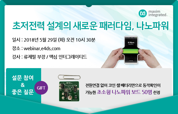 5월 29일 맥심 인터그레이티드 웨비나에서는 글로벌 기술 트렌드와 함께 나노파워에 대해 소개할 예정입니다. 나노파워는 무엇인지, 초저전력 대기전력 설계에 나노파워를 어떻게 구현하는지, 나노파워를 사용할 수 있는 애플리케이션과 주의해야할 애플리케이션에는 무엇이 있는지 설명하겠습니다.
