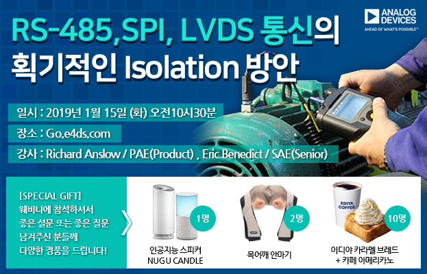 이번 웨비나에서 다룰 내용은 고가의 장비를 보호하고 전기적 노이즈에대한 저항력을 올려주기 위한 Isolation의 사례라고 할 수 있으며, 아나로그 디바이스의 RS-485, LVDS 그리고 SPI등의 통신 인터페이스에 Isolation 기능을 결합 함으로써, 제품에서 얻을 수 있는 다양한 효용성을 살펴 보도록 하겠습니다.