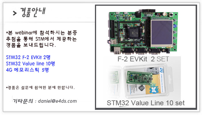 이번 webinar에서는 STMicroelectronics의 STM32-F2를 활용하여 Ethernet에 관한 기초적인 사항부터 최신의 적용 기술 Know How를 설명합니다. Webinar 내용: Introduction & Objective -Becoming Familiar with STM32F2xx & ethernet Basic Ethernet Knowledge -What is Ethernet Real Ethernet Connections MAC-Address,TCP,UDT.. etc -Where to use Ethernet in real life? STM32F2xx -STM32F2xx Blocks -Ethernet H/W Block Ethernet I/F methods -DCMI(Digital Camera Media I/F) H/W-Block Brief explanation -STM3220G-Eval Brief review Softwares for Demo -1wIP structure How to use 1wIP in STM32F2xx APIs in 1wIP Library -How to communicate with PC APIs for socket? -IP-CAP demo IP-CAM S/W Structure (F/W & PC-S/W) Show Demo -Telnet,HTTP Serve