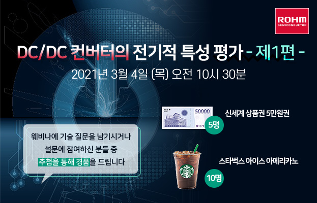 이번 웨비나에서는 「DC/DC 컨버터의 전기적 특성 평가 - 제1편」 이라는 주제로, 실제 회로 동작 및 특성에 있어서 어떤 부분을 어떤 방법으로 평가해야 하는지에 대해서, 각 평가 항목에 따라 설명하도록 하겠습니다.