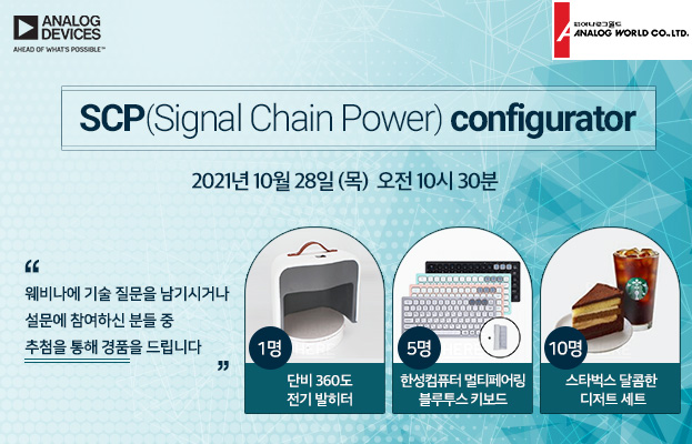 두 번째, SCP(Signal Chain Power) configurator에서는 시스템 하드웨어를 설계할 때 필요한 signal chain DC Power 블록을 쉽게 구성하도록 돕고 있습니다.