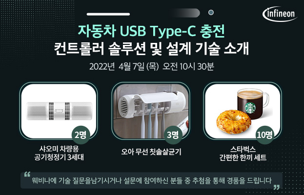 이번 웨비나를 통해 차량용 USB Type-C 충전 포트를 개발하실 수 있도록 도움을 드리고자 합니다. 여러분의 많은 참여 부탁 드립니다.
