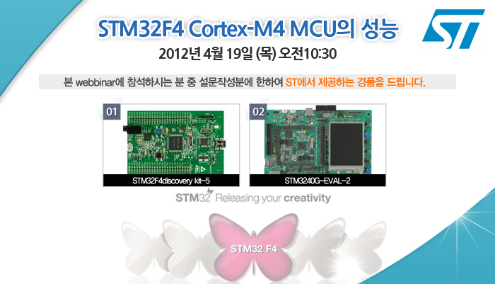ST에서 새롭게 출시한 STM32F4 MCU에 대한 소개와 기존 제품과 차별화된 성능을 경험할 수 있는 데모가 준비되어 있습니다. 그 세부적인 내용으로 Cortex-M4 Core에대한 설명과, M4 Core를 기반으로 어떻게 STM32F4제품이 210DMIPS(168MHz)까지 그 성능을 끌어 올릴 수 있는지 MCU성능에 주안점을 두고 설명드릴 예정입니다.