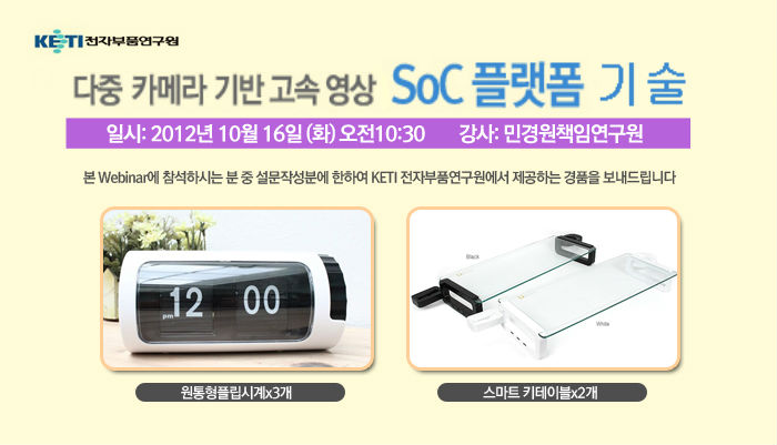 최근 급격한 차량의 전장화에 따른 센서의 채용 비율이 급속도로 증가되고 있습니다. 특히 전 세계적인 차량 안전기능 강화 요구에 따라 차량의 사고예방을 위한 충돌방지 지능형 센서 및 시스템에 대한 개발이 급속도로 진행되고 있는 상황입니다. 블랙박스 뿐 아니라 어라운드뷰 등의 용도로 차량 내 탑재되는 카메라 개수의 증가에 따라 카메라 기반의 영상인식 기술에 대한 중요도는 더욱 크게 증가하고 있는 추세입니다. 본 기술세미나를 통해서는 전자부품연구원과 한국 전자통신연구원이 공동 개발하고 있고 다채널로 동시 입력되는 영상으로부터 검지하고자 하는 대상 오브젝트(예:차량, 보행자 등)를 실시간 검지, 추적, 경보 하는 SoC기반 임베디드형 고속 비전인식 프로세싱 플랫폼인 다중카메라기반 고속 영상인식 SoC 플랫폼을 설명하고 차량용 반도체 및 영상기반의 다양한 어플리케이션을 구동하기 위한 시스템의 개발 동향을 파악해 봅니다. 나아가 위 기술이 알맞는 분야에 적용되어 더 큰 비즈니스로 확장하는 기업을 발굴 해내는 것 또한 한가지 목적입니다. 그럼 세미나에서 유익한 정보 많이 얻어가시기 바랍니다.